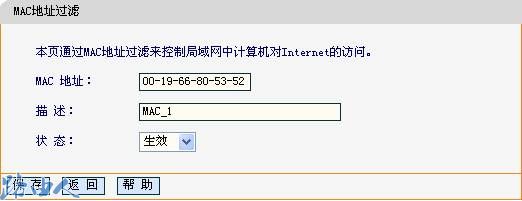 添加MAC地址:00-19-66-80-53-52,然后状态选择生效