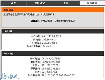 七、系统状态界面中看到PPPoE已经连接上,且友讯DI-524M无线路由器的WAN端也获取到了由电信部门分配的IP地址信息。