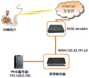 需要注意的是,外网用户输入的是D-LINK路由器WAN接口的IP地址125.33.191.62,而不是内部计算机的IP地址192.168.1.100。