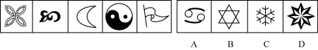 解析:此题的考点正是近两年图形题目的一大热门考点:图形的曲直性问题。题干中的五幅图都包含有曲线,而在4个选项中当中,明显只有A项包含曲线,而其他选项均由直线组成,因此答案应为A。