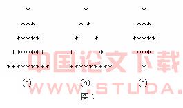 采用上面的方法,可以使学生很容易编写出类似的程序,其中的关键在于让学生找出图形中行号与每一行的空格数以及星号数的关系(对于图1(b)、(c)需要把图形分成几个部分,再分析其中的构成规律),这需要学生数学方面的知识,非编程本身的范畴了。