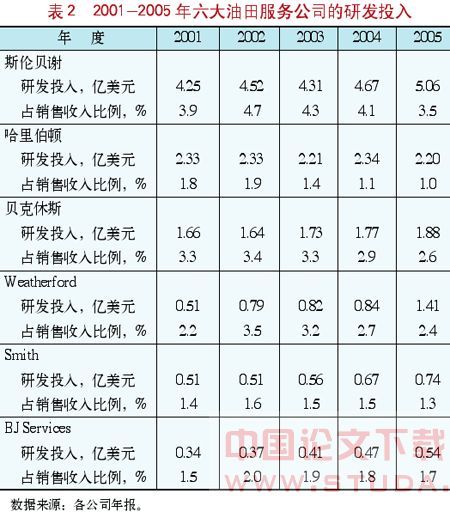 2001-2005年六大油田服务公司的研发投入及研发强度见表2。