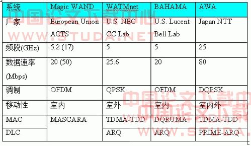 移动无线宽带接入还包括欧洲ACTS项目中著名的AWACS、SAMBA及MEDLAN系统,其工作频段分别使用19GHz、40GHz、 61GHz等,MEDIAN为室内慢速移动,AWACS及SAMBA可用于室外较高移动速度的情况,覆盖范围一般较小,为数十米至200米左右。它们的目标是实现155Mbps乃至速率更高的移动或半移动环境下高速优质多媒体个人通信服务。