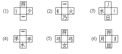 (9)请在下面各图“十”字形中间的空格里,分别填上一个字,使它能和上下,左右的偏旁部首各拼成一个字。