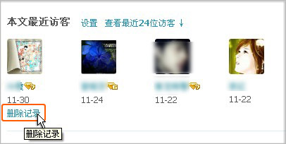 第一步:登录您QQ空间日志,打开单篇日志,在日志本文最近访客处,将鼠标移动到访客头像下方,会显示“删除记录”;